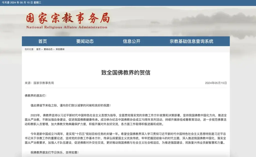 2024-05-16佛教界的朋友们:值此佛诞节来临之际,谨向你们致以诚挚的问候和良好的祝愿!2023年,佛教界坚持以习近平新时代...