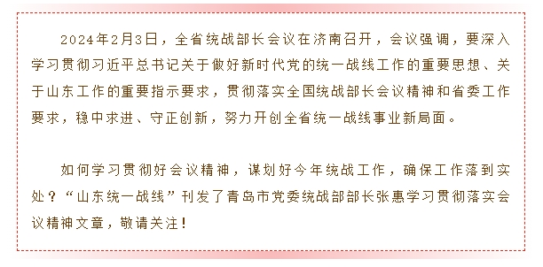 2024-03-172024年2月3日,全省统战部长会议在济南召开,会议强调,要深入学习贯彻习近平总书记关于做好新时代党的统一战...