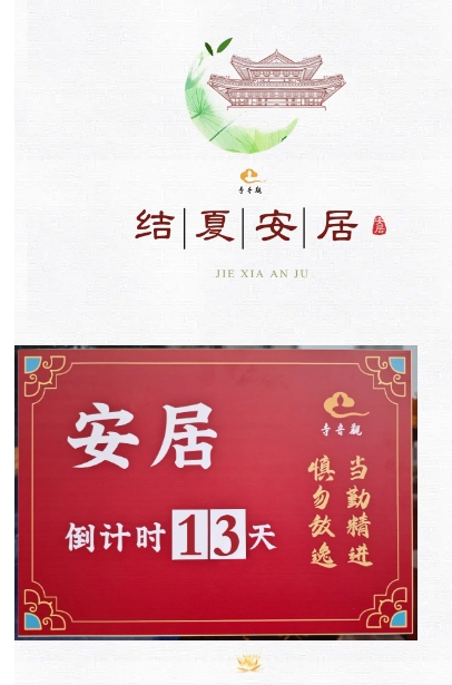 每年农历四月十六日至七月十五日,是结夏安居的日子。在此期间,出家众禁止外出,聚居一处精进修行。安居的首日,称为结夏。安居旨在严禁无故外出,以防离心散乱,因此是一种自修自度的观照功夫,是养深积厚,是自我沉潜的修行。