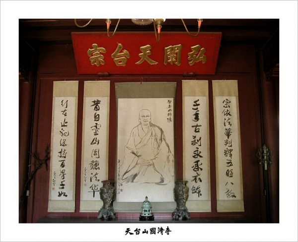 智者大师(西元五三八至五九七年),陈隋时代的高僧。俗姓陈,字德安。祖籍颖川(今河南许昌),生于荆州华容(今湖南潜江西南)。宿具善根,卧便合掌,坐必面西,见像便礼,逢僧必敬。双眼重瞳,颇有古帝王之相。年幼时,好往伽蓝亲近三宝,且能背诵《观世音菩萨普门品》。十八岁投相州果愿寺法绪法师出家,二十岁受具足戒。不久,跟随慧旷律师学习律藏,兼通大乘方等经典。后入太贤山,诵《法华》、《无量义》、《观普贤菩萨行法》等诸经,历二旬,即能通晓其义。陈天嘉元年(西元五六○年),入光州大苏山参谒慧思禅师,慧思禅师为其示现普贤道场,讲说“四安乐行”,智顗乃于此山修行“法华三昧”。一日,持诵《法华经》至《药王品》“是真精进,是名真法供养”,豁然大悟,心境明朗。慧思禅师赞叹说:“这种境界,非你莫证,非我莫识。”自此以后,常令代讲解佛法妙义。光大元年(西元五六七年),三十岁的智者大师受慧思禅师咐嘱,辞别大众,到南朝陈都金陵弘法,居瓦官寺宣讲《法华》,标立宗义,判释经教,演绎禅法,讲说修禅次第法门,为天台宗奠定教观的基础。八年契理契机的弘法活动,度人无数,上至皇亲国戚、达官显贵,下至一般黎民百姓等,无不欣重顶戴。智者大师与瓦官寺的声名因此大盛,前来归仰的学者徒众也日益增多。其后,智者大师感慨闻法的人虽然很多,但真正悟道的人却很少。为了免于名闻利养的束缚,与求更上一层的证悟,乃决定隐居天台山继续用功。太建七年(西元五七五年),智者大师隐居天台山,十年的头陀苦行,降魔修道,思想大为转进。天台西南的华顶峰,就是他悟道的地方。因陈后主多次的恳请,智者大师于至德三年(西元五八五年)再入金陵,于太极殿讲《大智度论》及《仁王般若经》,又于光宅寺讲《法华经》等。智者大师一生,曾多次入住天台山及庐山,致力于着书立说,勤于修持禅定。也曾多次进入皇宫大殿,为陈后主说法,为隋炀帝传授菩萨戒,又至金陵弘法度众。陈宣帝尊他为国师,隋炀帝尊称他“智者大师”。其一生建造寺院三十六所,度僧一万四千人,传法弟子三十二人,着书一百四十余卷,大部份由其弟子灌顶记录整理而成。最重要的有“天台三大部”,即《法华玄义》、《法华文句》、《摩诃止观》。智者大师将法华思想与龙树菩萨的教学,以中国独特的形式加以体系化,并将佛教经典分为五种,将佛陀教化的方法与思想内容分为四种。此综合性佛教体系的组织,被视为具有代表性的“判教”。此外,依禅观而修持止观,也是智者大师独创的法门。智者大师禅教一致,行解并重,悲智双运,福慧双修,是大乘的菩萨行者,被尊为“智者”,当之无愧。同时他也是将佛学中国化的第一人,最具中国佛教思想特色的天台宗,就是由智者大师完成思想体系的。